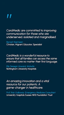 At CardMedic, we envisage a world without language barriers. We are on a mission to enable understanding and give everyone a voice, regardless of ability or background, by creating the world’s most inclusive and accessible language platform. Co-founded by a frontline clinician and developed with a multi-disciplinary team from across the globe, at the heart of CardMedic is the drive to eliminate language barriers, enhance access, and improve outcomes and satisfaction. Feedback from staff, patients and members of the public is at the core of enhancing our product - so please get in touch with any thoughts, comments or suggestions at