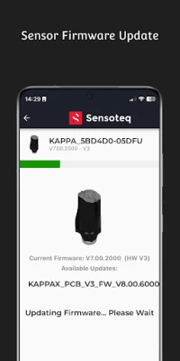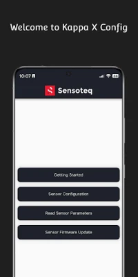 The app also provides: • 'Connect to Sensor': Functionality to 'read' the existing parameters for a given Kappa X sensor (subject to compatibility). • 'Sensor Firmware Update': Wireless / 'Over the Air' (OTA) firmware updates, when released and provided exclusively by Sensoteq. • 'Glossary': Glossary describing the terminology associated with the configurable parameters for further information.