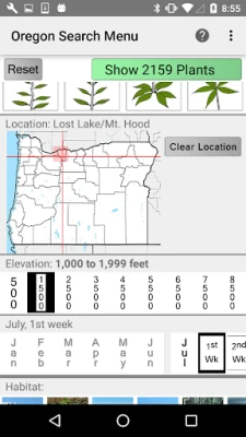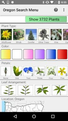 The App includes 4,159 species of plants found in Oregon. Overall, 2,564 are "Wildflowers", 324 are shrubs, 130 are broadleaf trees, 39 are conifers, 37 are vines, 472 are grass-like, 77 are fern-like, 264 are moss-like, 119 are seaweed and 264 are lichen.